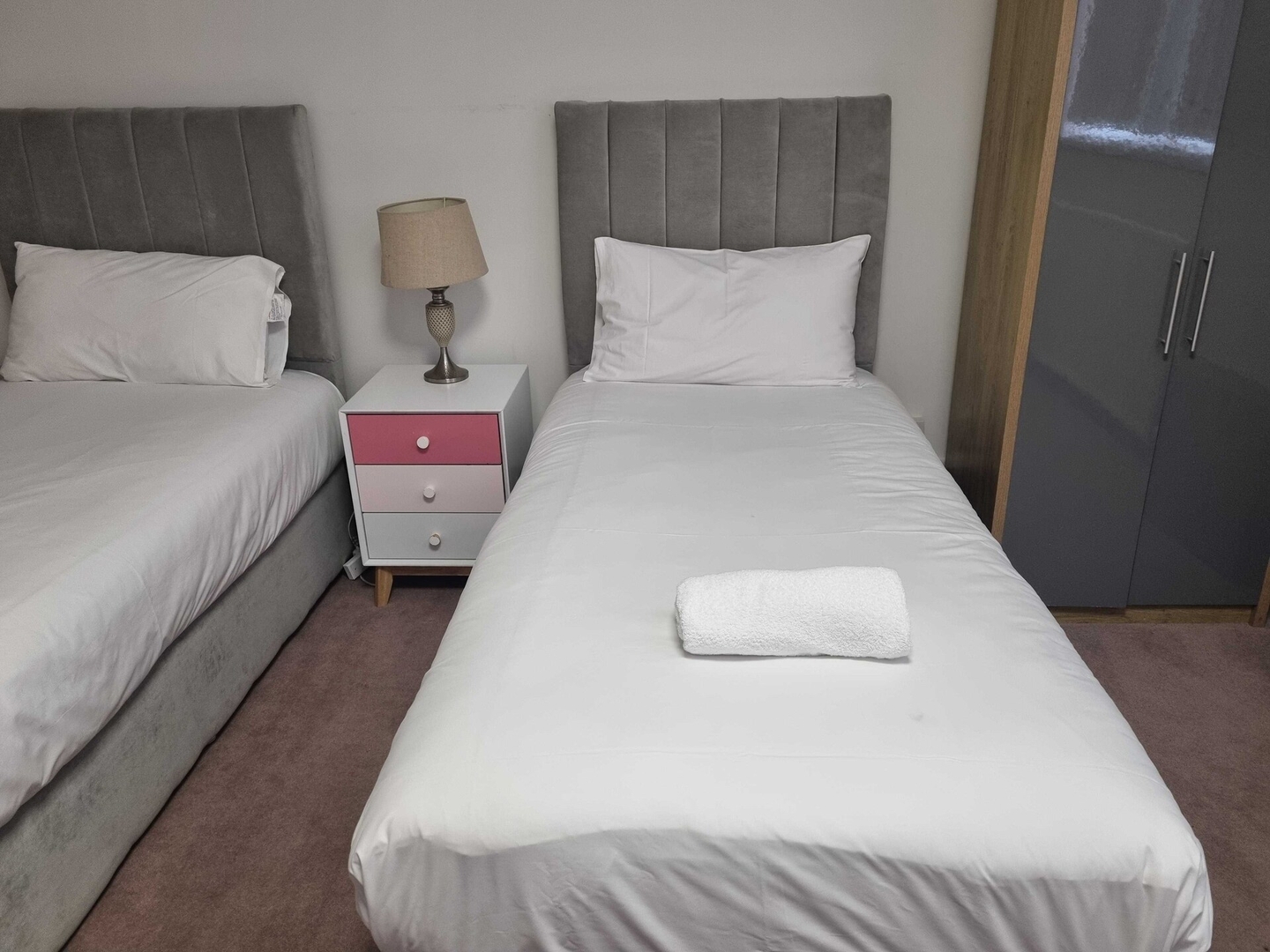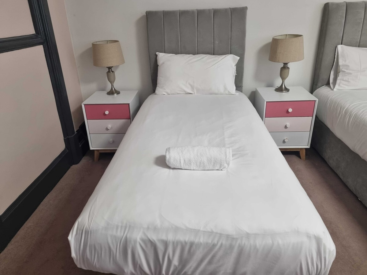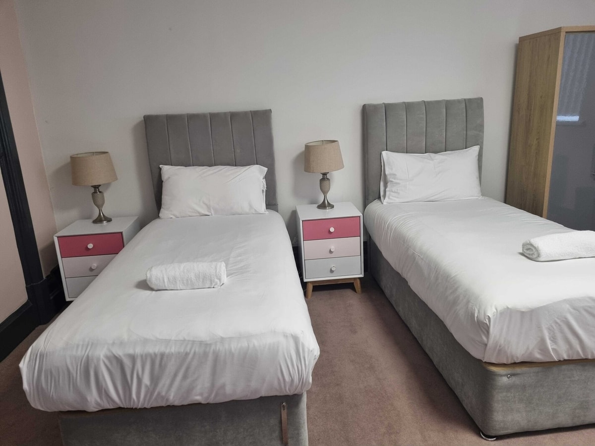 Welcome to your cozy twin room — perfect for friends, colleagues, or solo travellers needing a peaceful rest. With two comfy single beds, fast Wi-Fi, fresh linen, and a tidy shared bathroom and kitchen, you’ve got all the basics covered. Located in a quiet area with great transport links, you’ll be close to everything without the noise. Ideal for short or long stays. Self check-in and flexible support included!