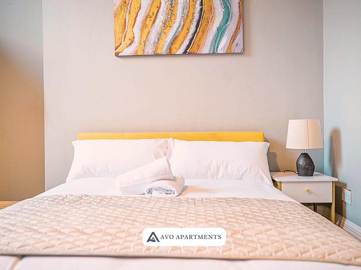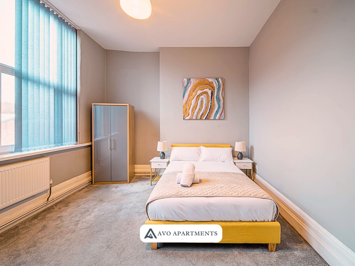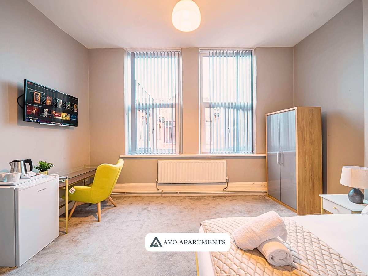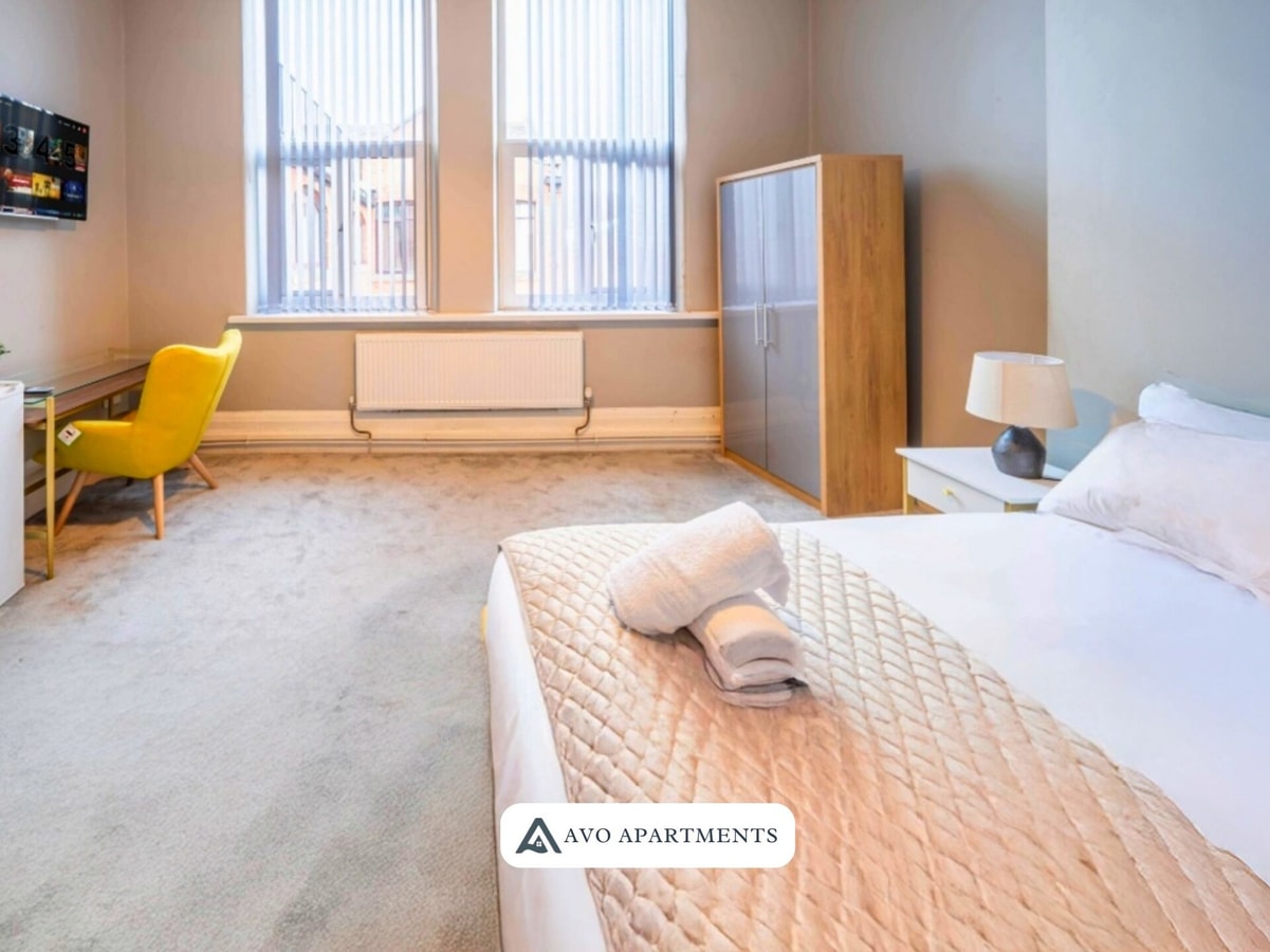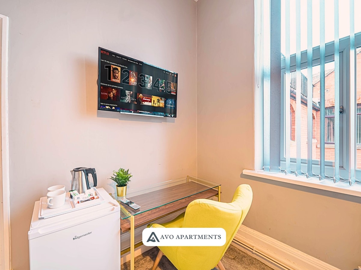 Enjoy a comfortable stay in this bright private room in Sheffield, perfect for business trips, study visits, or short city breaks. With a cosy double bed, fresh linens, and cheerful yellow touches, the space feels both welcoming and practical. The room includes a Smart TV, wardrobe, desk with chair, and a bedside table with lamp, making it convenient for both work and relaxation. Large windows bring in plenty of natural light, creating an airy and uplifting atmosphere.